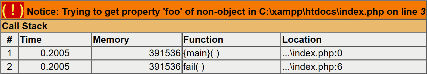 Notice: Trying to get property 'foo' of non-object in index.php on line 3